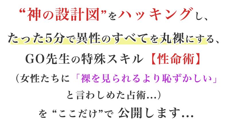 占術家GO先生の「特殊スキル性命術」をマスターして、女性との出会いや恋愛にフル活用していくマニュアルになっています。