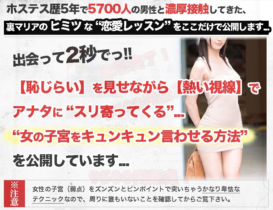 「マリアの出会って2秒で子宮をキュンキュンさせる男になる方法」は、数多くの男性を見てきたホステスさんが教える恋愛テクニックです。