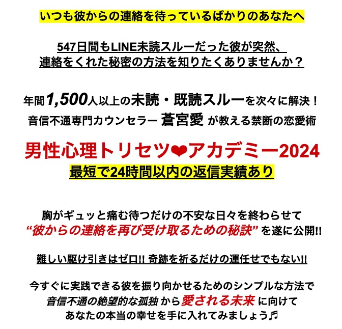 「男性心理トリセツアカデミー2024」では、あなたが直面する愛する人からの突然の音信不通に対する実践的な解決策を提供します。