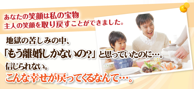 「夫の浮気・解決法」では、浮気をしたご主人が、「自分の意思」であなたの元に戻ってきて、以前よりも、より一層あなたを愛するようになる方法を提供しています。