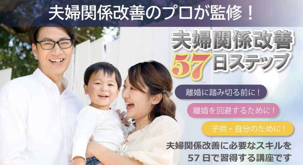 夫婦関係で悩んだとき、離婚が頭をよぎったとき、是非、夫婦関係改善57日ステップ!をご活用ください。
