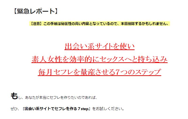 「出会い系でセフレを作る7つのステップ」では、出会い系サイトを使って素人女性とセックスするために必要な具体的な手法を公開しています。