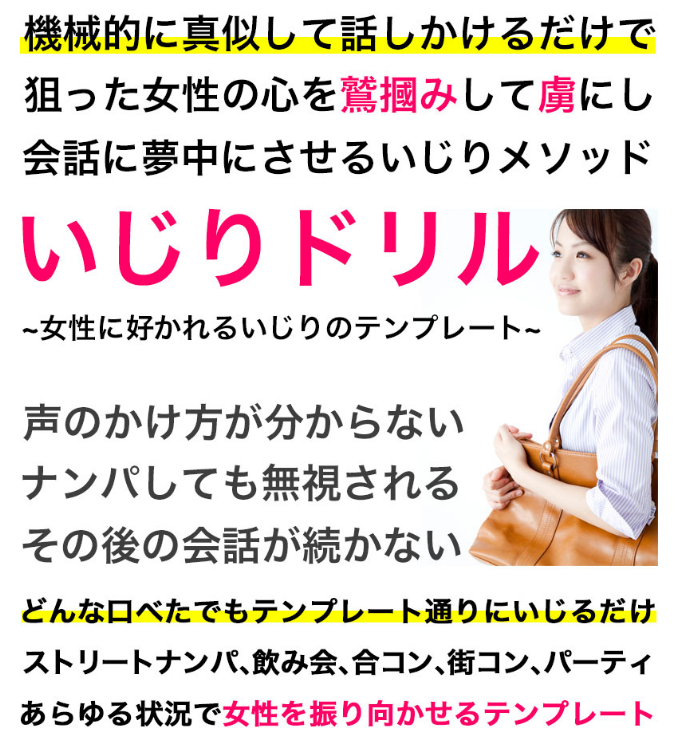 「いじりドリル集」は、恋愛初心者でも美女を虜にする「正しい」いじりの法則をまとめた教材です。